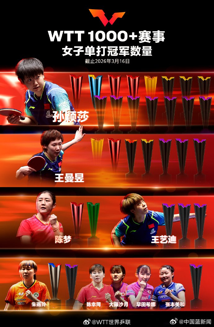 【#孙颖莎15座单打冠军稳居榜首#】3月16日,WTT1000+冠军榜更新!孙颖莎以15座单打冠军稳居榜首,王楚钦12座领跑男单,两人分列第一遥遥领先。孙颖莎的奖杯就快摆不下了,运动员们真棒,继续加油!#妹妹宝孙颖莎##林诗栋世排掉至第5#(来源:WTT世界乒联)